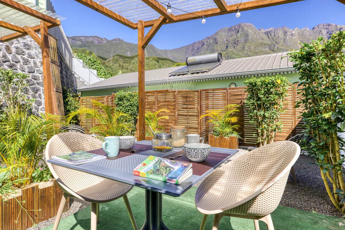 Un espace pergola indépendant dans le jardin partagé complète l'ensemble, parfait pour un repas en extérieur ou une pause nature. tout en admirant la vue sur le Piton des Neiges.