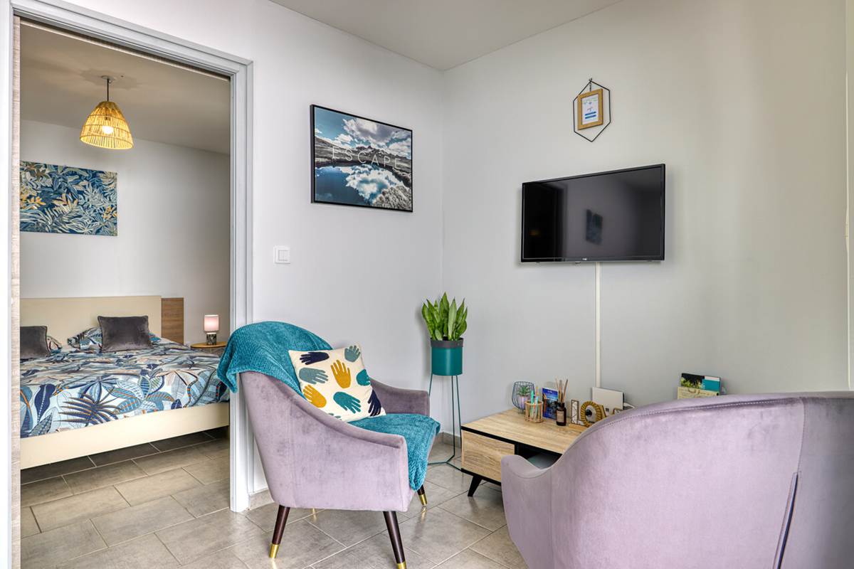 Le Cocon dispose d'un séjour lumineux, d'une chambre double, d'une salle de bain privative et d'une cuisine fonctionnelle.